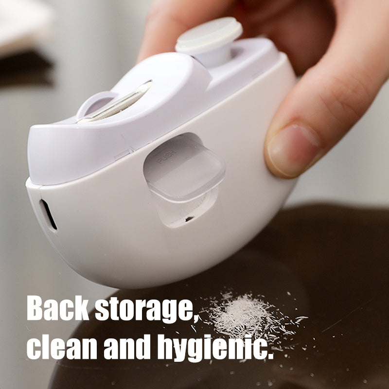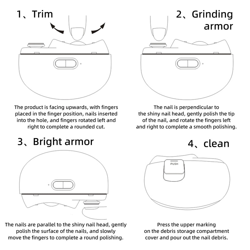 1. Limpieza de restos de uñas: Presione la parte superior de la tapa del compartimento de almacenamiento de restos, la tapa se abrirá. Vierte los restos de uñas y limpia el compartimento con un cepillo pequeño.
