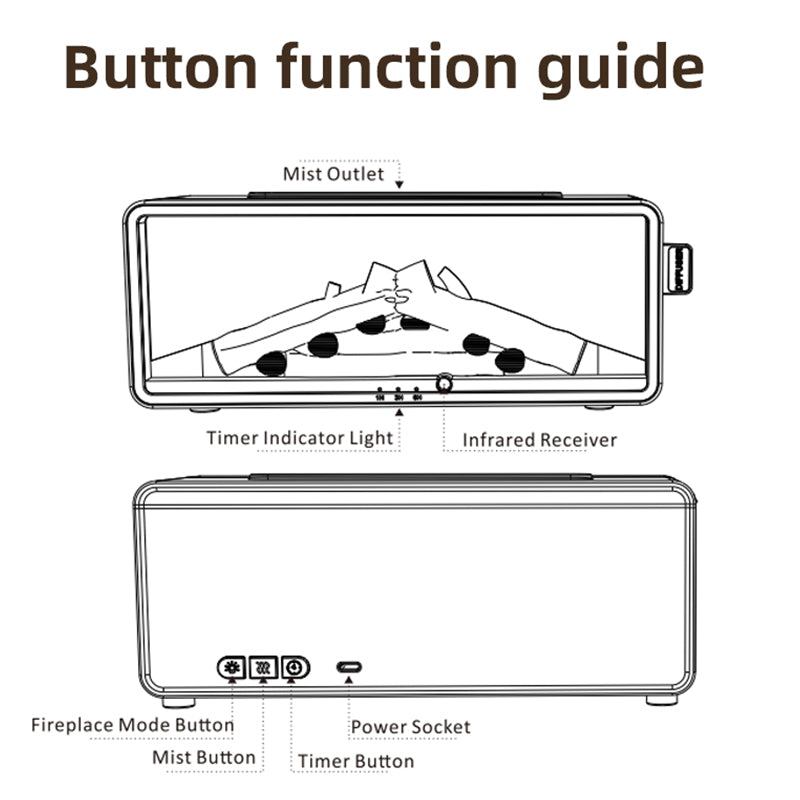 3. 暖炉ボタン:暖炉ライト点灯(8時間自動オフ)、次で色変化、固定、オフ。