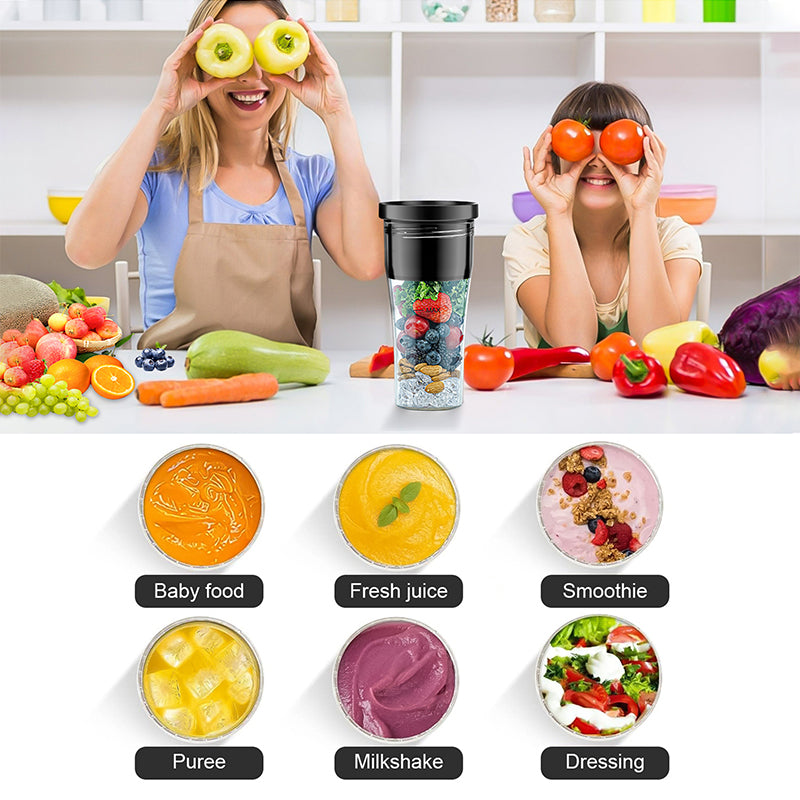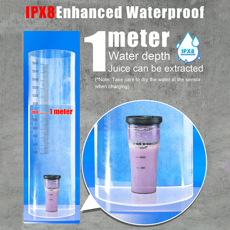 フルーツをカップの最大容量の60%まで入れ、次に水をカップの最大容量まで加えます。その後、モーターキャップをカップにしっかりと取り付け、青いライトが点滅するのを確認してください。これにより、モーターキャップがマイクロスイッチを作動させ、起動準備が整ったことが確認できます。
