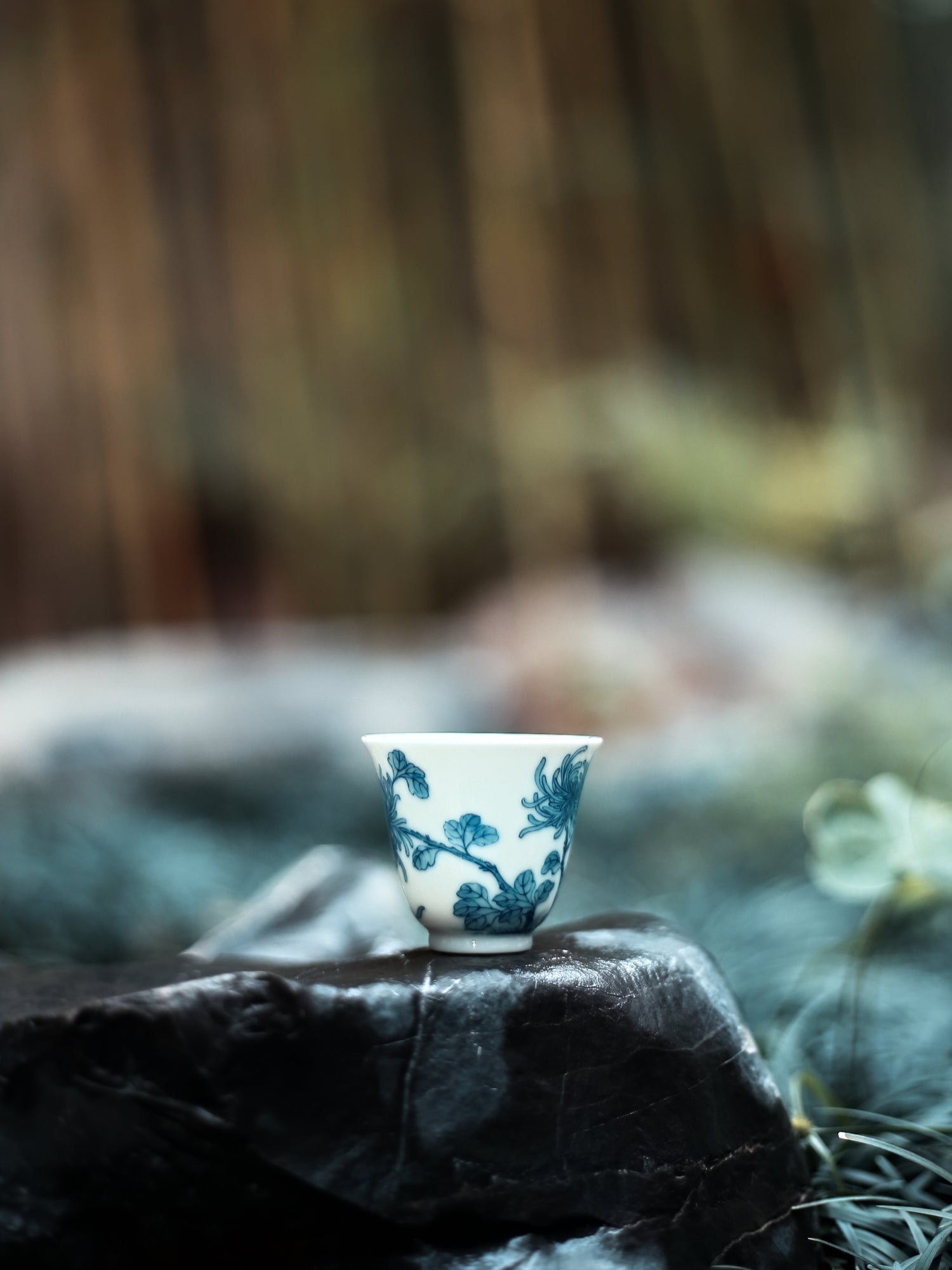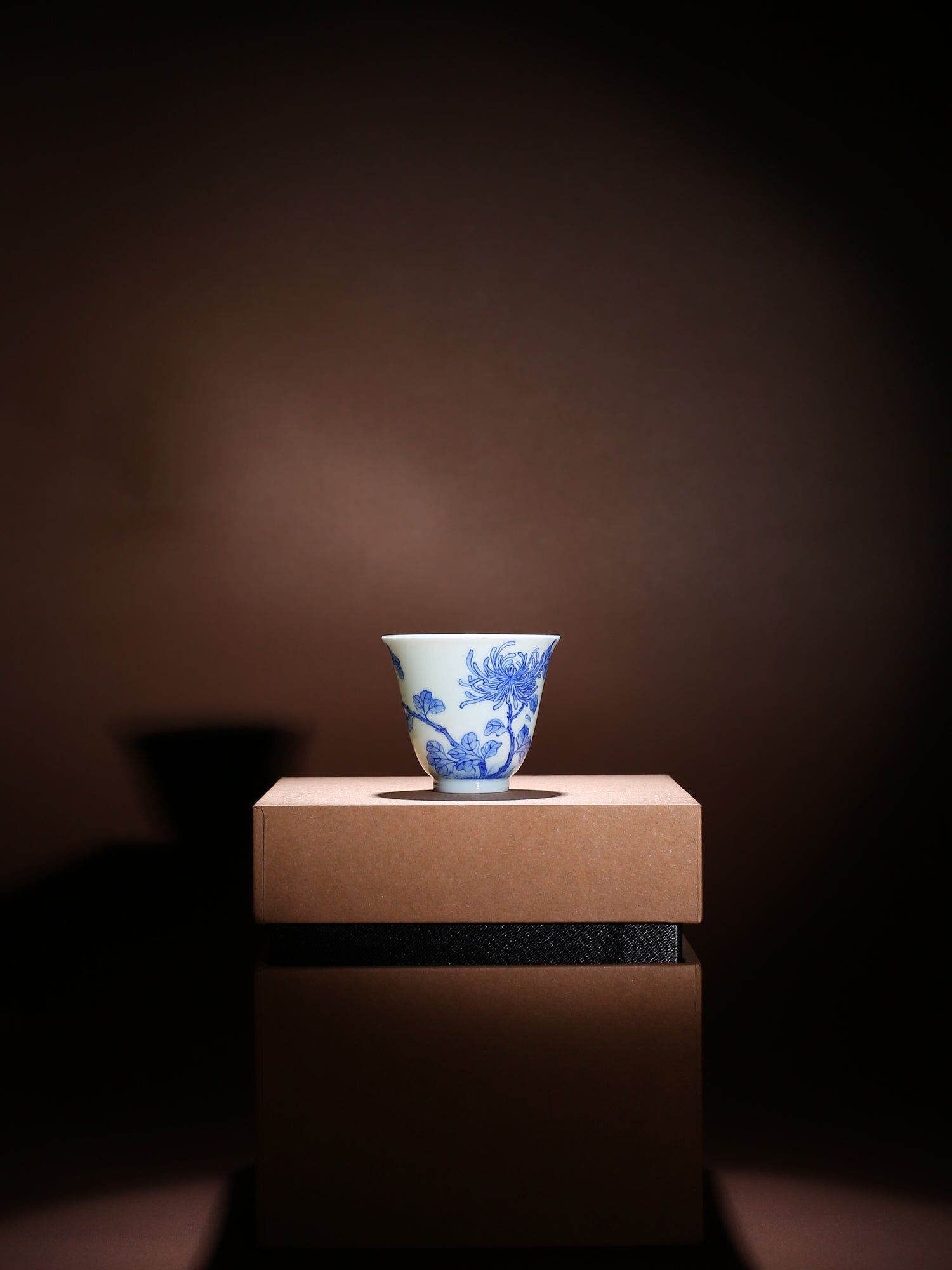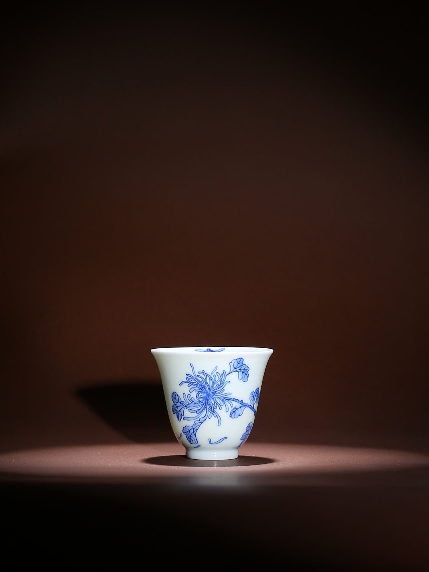Ceașcă de aromă premium pictată manual Oriday Ceașcă de ceai pentru gazdă din porțelan albastru cu alb cu model de crizantemă Ceașcă de degustare pentru ceai Kung Fu
