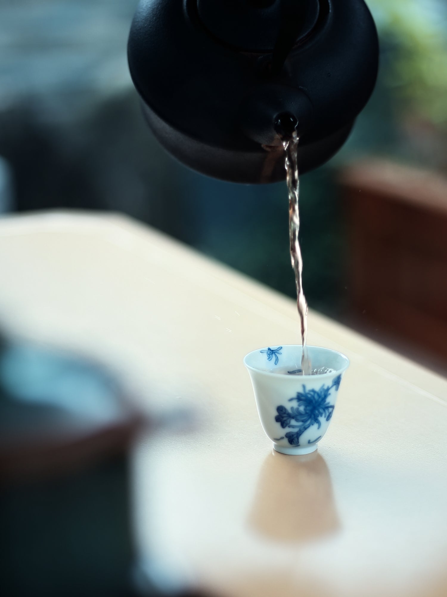 · Vase albastre și albe rafinate care adaugă farmec artei ceaiului.